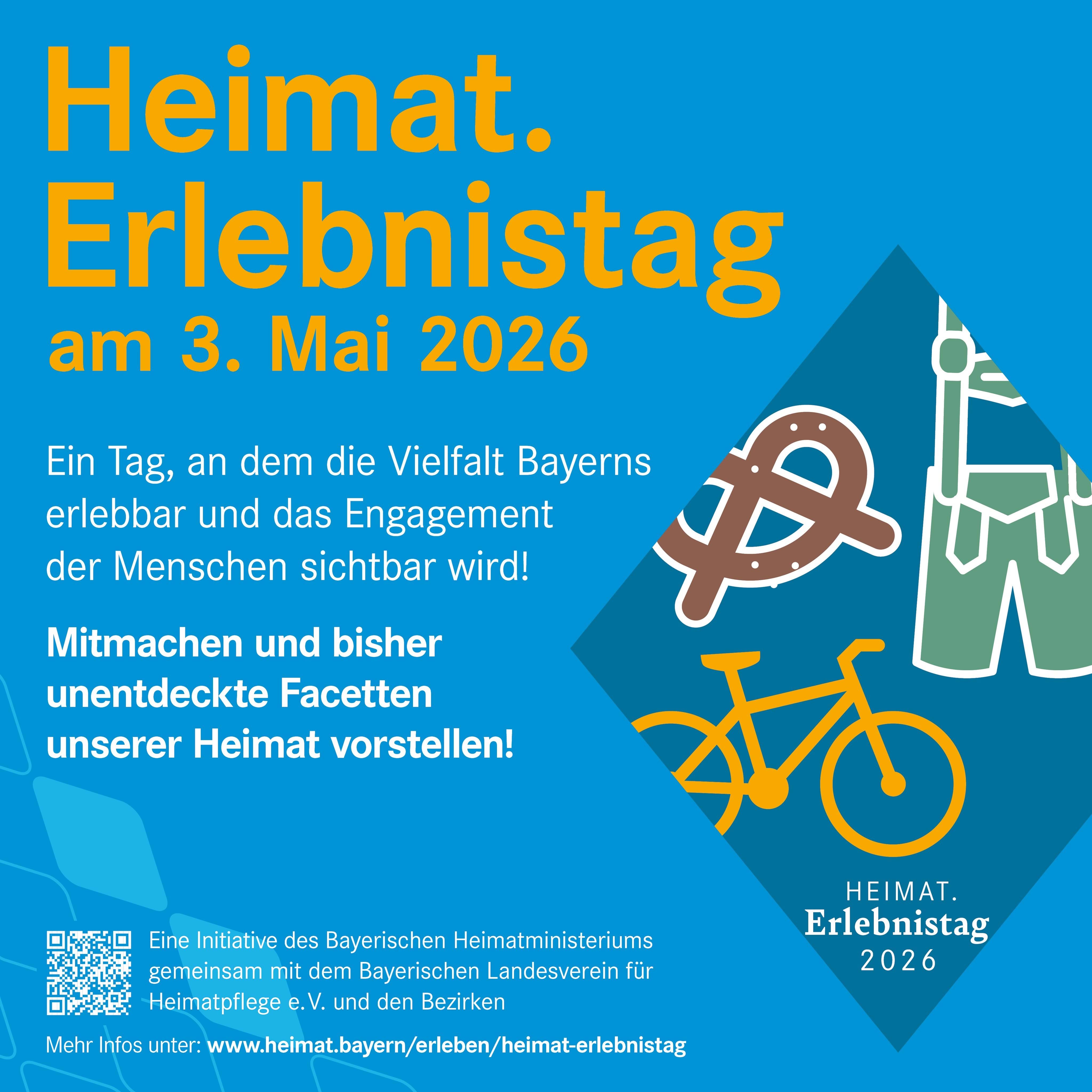 Beim Heimat.Erlebnistag am 3. Mai 2026 sind alle eingeladen, Bayerns Kultur, Natur und Traditionen zu präsentieren. Ob kleine Feste, Ausstellungen oder besondere Aktionen – zeigen Sie, was Ihre Region ausmacht.
